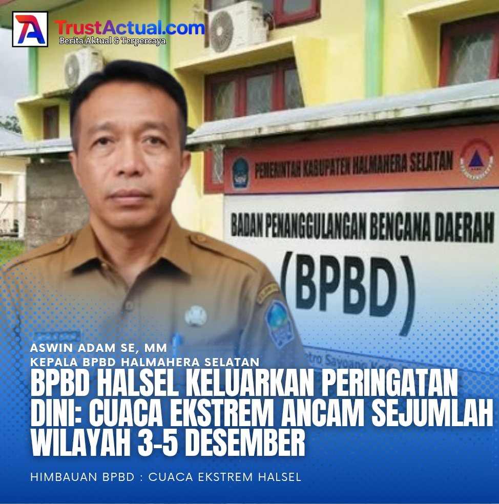 HALSEL, TrustActual.com — Badan Penanggulangan Bencana Daerah (BPBD) Kabupaten Halmahera Selatan mengeluarkan Peringatan Dini Cuaca untuk periode 3–5 Desember 2025. Peringatan ini disampaikan menyusul potensi cuaca ekstrem berupa hujan sedang hingga lebat yang dapat disertai kilat/petir, angin kencang, serta gelombang laut tinggi di sejumlah wilayah.