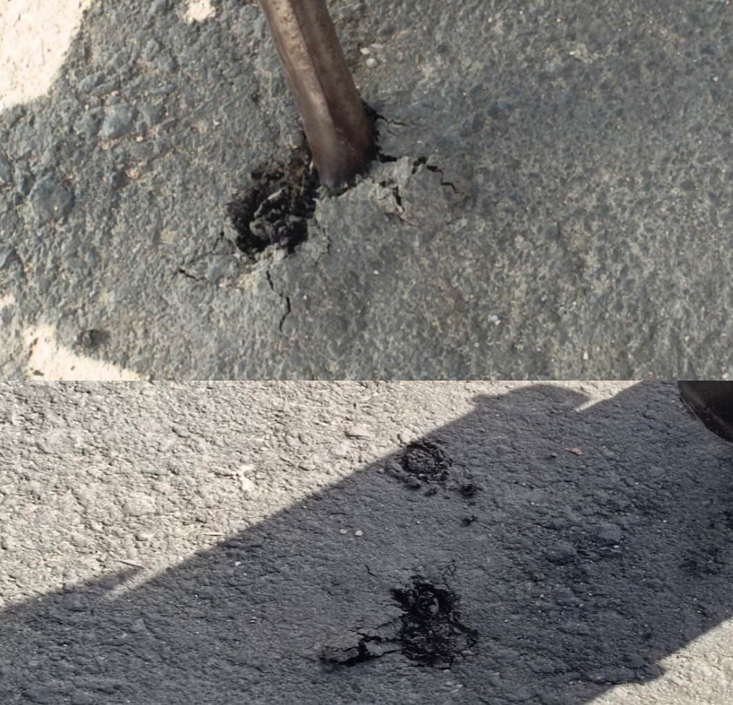 Dari pengamatan di lapangan pada tanggal 20 Desember 2025, aspal tampak tidak padat. Tekstur permukaan rapuh. Daya rekatnya lemah. Sebuah indikasi bahwa kualitas perkerasan tidak sesuai dengan ketahanan yang seharusnya dimiliki jalan umum.
