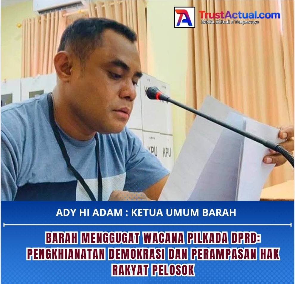 HALSEL, TrustActual.com – Barisan Rakyat Halmahera Selatan (BARAH) melontarkan penolakan keras terhadap wacana pemilihan kepala daerah melalui Dewan Perwakilan Rakyat Daerah (DPRD). Ketua BARAH, Ady Hi Adam, menyebut gagasan tersebut sebagai pengkhianatan terhadap demokrasi dan perampasan hak konstitusional rakyat, khususnya masyarakat yang hidup di wilayah pelosok.