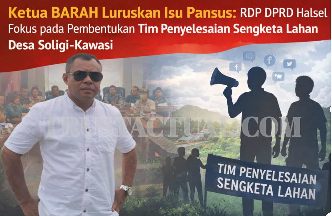 TRUSTACTUAL.COM — Polemik di ruang publik terkait wacana pembentukan Panitia Khusus (Pansus) DPRD Halmahera Selatan diluruskan. Ketua BARAH, Adi Hi. Adam, menegaskan bahwa substansi utama yang dibahas dalam Rapat Dengar Pendapat (RDP) bukanlah pembentukan pansus, melainkan pembentukan Tim Penyelesaian Sengketa Lahan Desa Soligi–Kawasi.