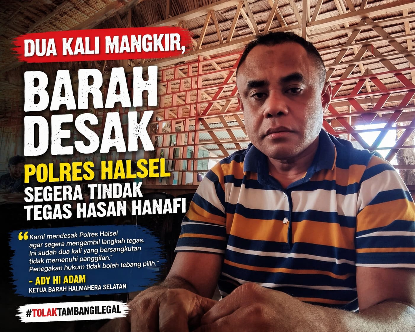 “Kami mendesak Polres Halsel agar segera mengambil langkah tegas. Ini sudah dua kali yang bersangkutan tidak memenuhi panggilan. Penegakan hukum tidak boleh tebang pilih,” tegas Ady, Selasa (14/4/2026).