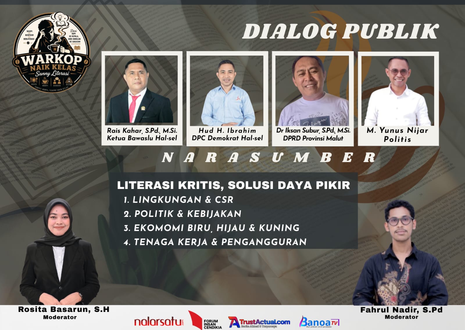 Kegiatan tersebut terbuka untuk umum dan menghadirkan sejumlah narasumber dari berbagai latar belakang, yakni Rais Kahar, S.Pd., M.Si (Ketua Bawaslu Halmahera Selatan), Hud H. Ibrahim (DPC Partai Demokrat Halmahera Selatan), Dr. Iksan Subur, S.Pd., M.Si (Anggota DPRD Provinsi Maluku Utara), serta M. Yunus Nizar (Politisi).