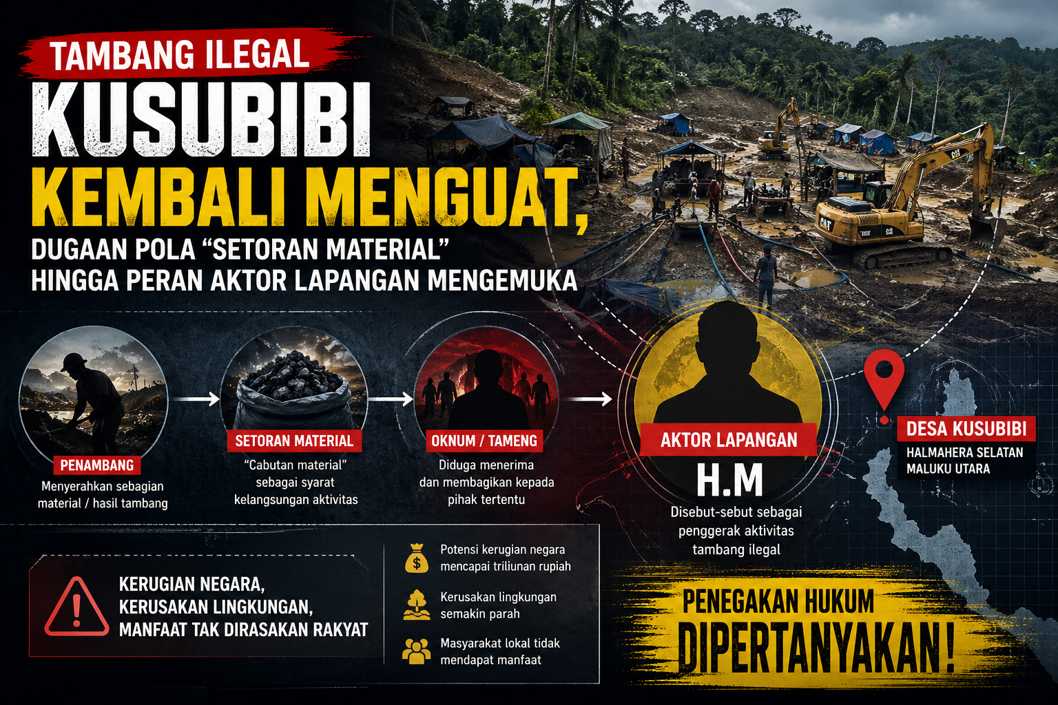 TRUSTACTUAL.COM— Aktivitas tambang ilegal di Desa Kusubibi kembali menunjukkan intensitas yang meningkat, meskipun sebelumnya telah dinyatakan ditutup beberapa bulan lalu. Temuan ini merujuk pada laporan investigatif media WartaGlobal.id edisi 19 April 2026 yang mencatat aktivitas penambangan masih berlangsung di sejumlah titik secara terbuka.